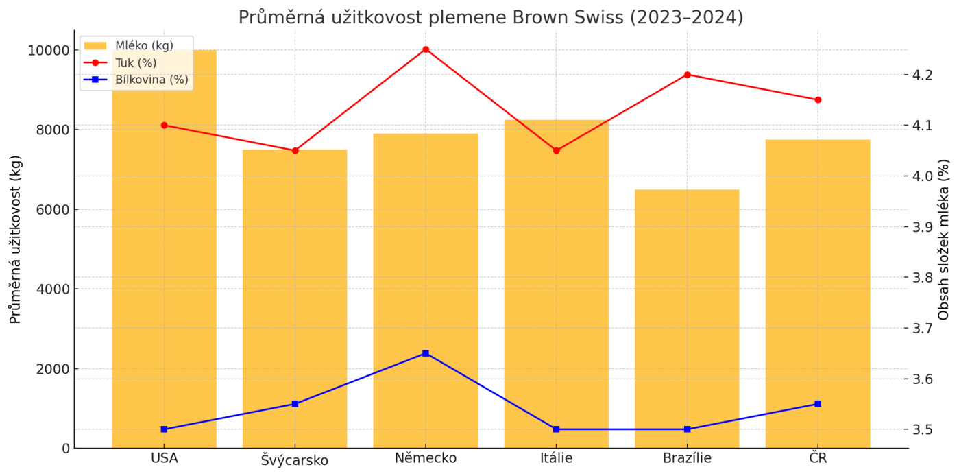- USA je geneticky nejvýznamnější populací pro moderní mléčný typ Brown Swiss – zaměření na produkci, exteriér a funkční znaky (zejména pevné končetiny a vemeno).