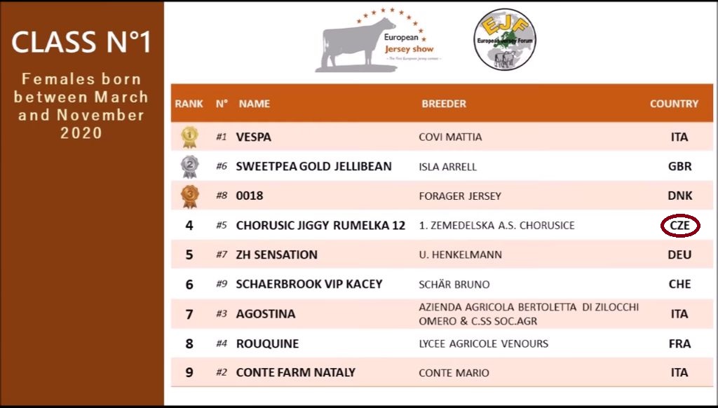 Dne 28.6.2021 byl zahájen první virtuální Evropský šampionát jerseyského skotu. Videa v daném formátu se zvířaty ve výstavní úpravě bylo nutné zaslat do 15.6.2021. Děkujeme tímto všem podnikům, které se měly chuť zapojit - ŠZP Lány ČZU (3ks), 1.zas Chorušice (3 ks), Farma Miller Svrkyně (1ks), Judr. Zdeněk Pelc Farma Dučický dvůr (1ks) a 2 kravky od nás z INPLEMu Tehov. Videa z šampionátu lze sledovat na facebooku, konkrétně na stránce „European Jersey Forum“ (odkaz níže). Při rozhodování kategorie jalovic se úlohy judge ujal kolumbijský chovatel DIEGO SIERRA CALDERON. Velice nás těší úspěch CZ 501244921 CHORUSIC RUMELKA 12, která obsadila krásné čtvrté místo v konkurenci jalovic z deseti zemí Evropy!
