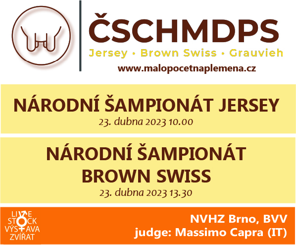 Národní šampionáty „barevných“ plemen jersey a brown swiss se uskuteční při Národní výstavě hospodářských zvířat v Brně 2023 a to už popáté. Poprvé se šampionáty konaly v roce 2013, od té doby se Český svaz chovatelů málopočetných dojných plemen skotu, z.s., kam tato dvě plemena patří, této milé tradice drží.